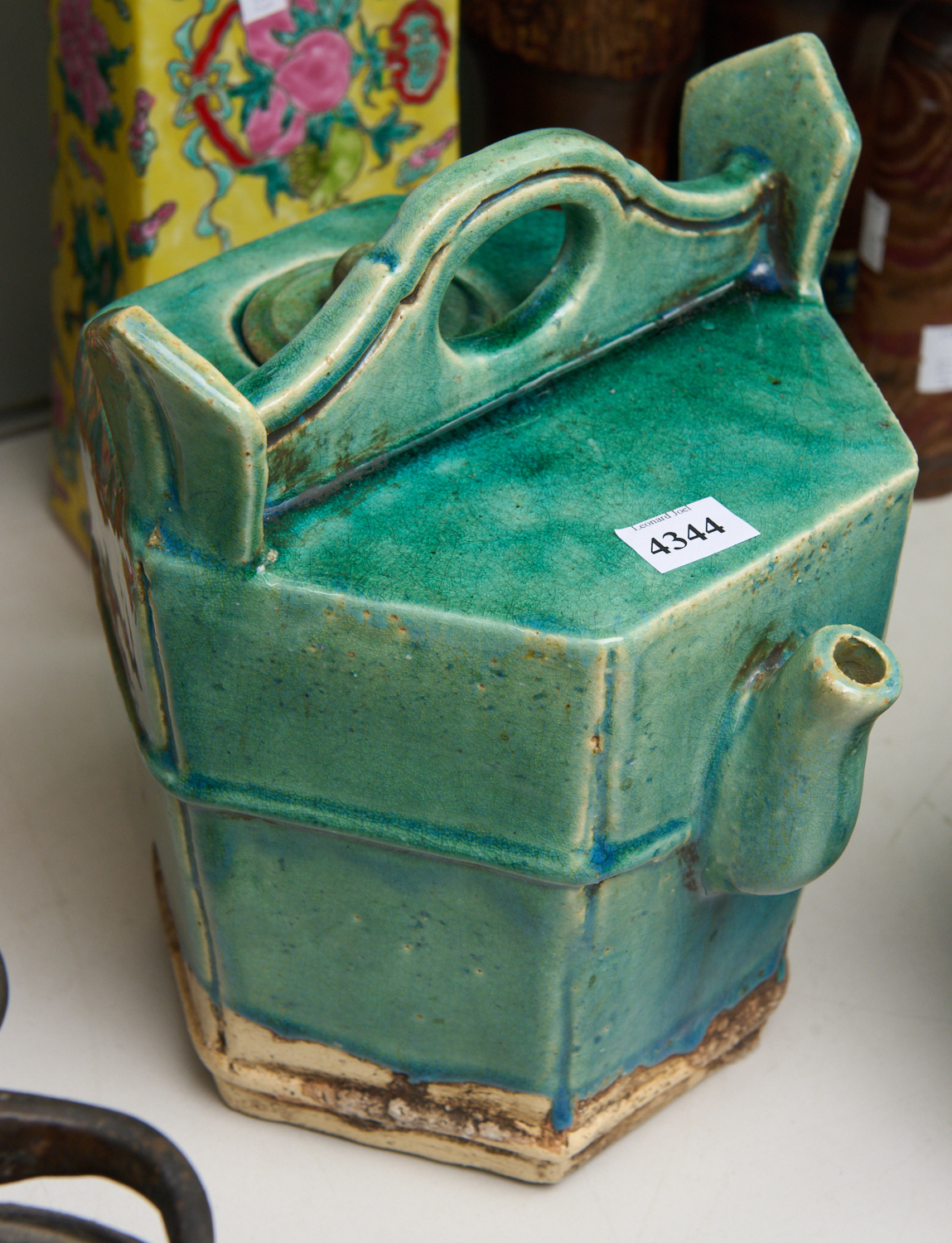 A CHINESE GREEN GLAZED TEAPOT OF HEXAGONAL FORM H.26CM, LEONARD JOEL LOCAL DELIVERY SIZE: SMALL