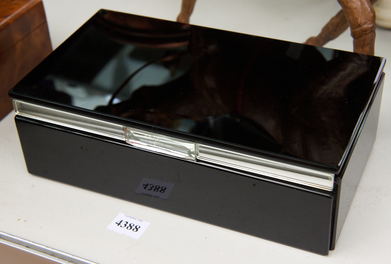 AN ART DECO BLACK MIRRORED GLASS VELVET LINED BOX, LEONARD JOEL LOCAL DELIVERY SIZE: SMALL
