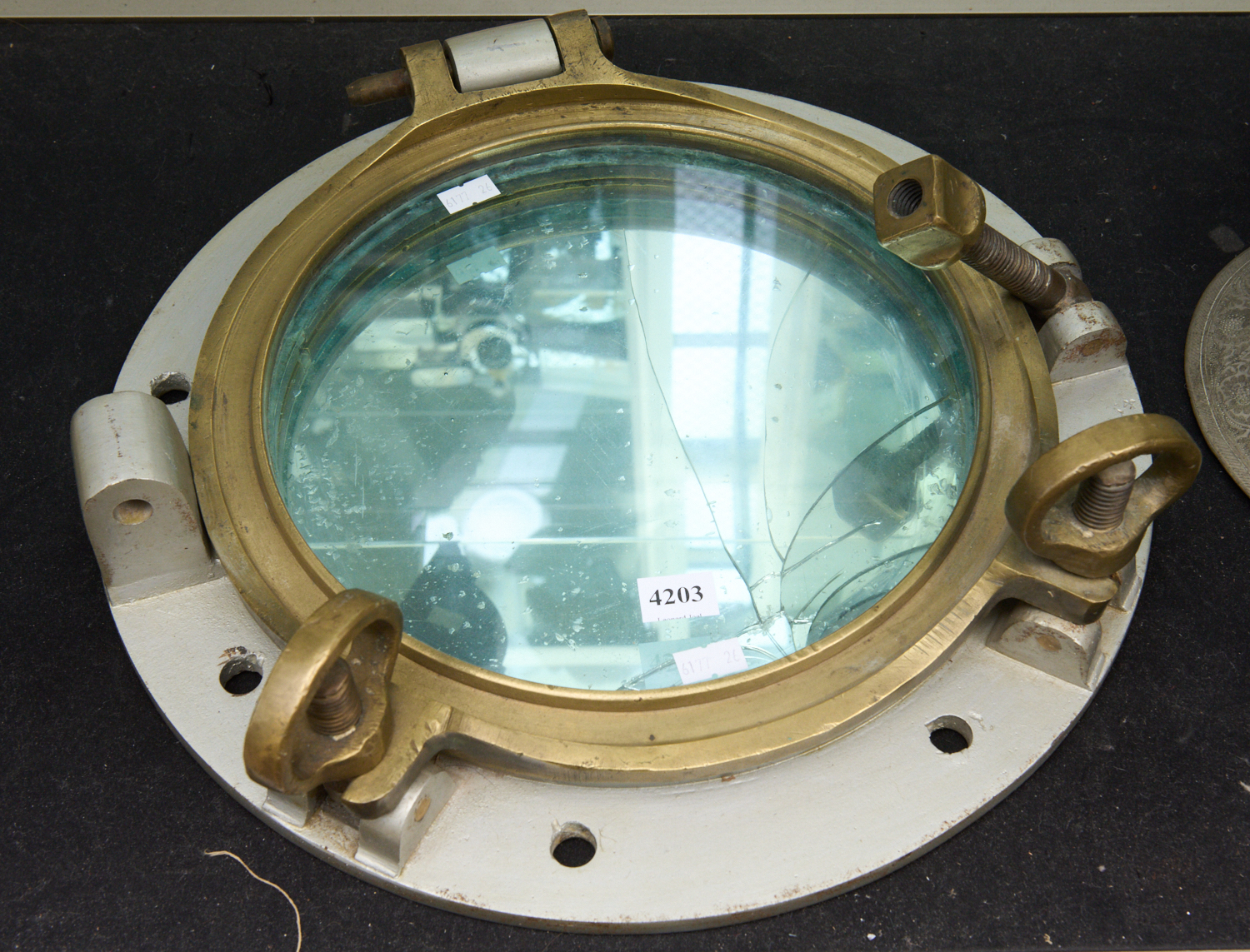 A BRONZE SHIPS PORTHOLE CONVERTED TO WALL MIRROR DIA.39CM (A/F), LEONARD JOEL LOCAL DELIVERY SIZE: MEDIUM