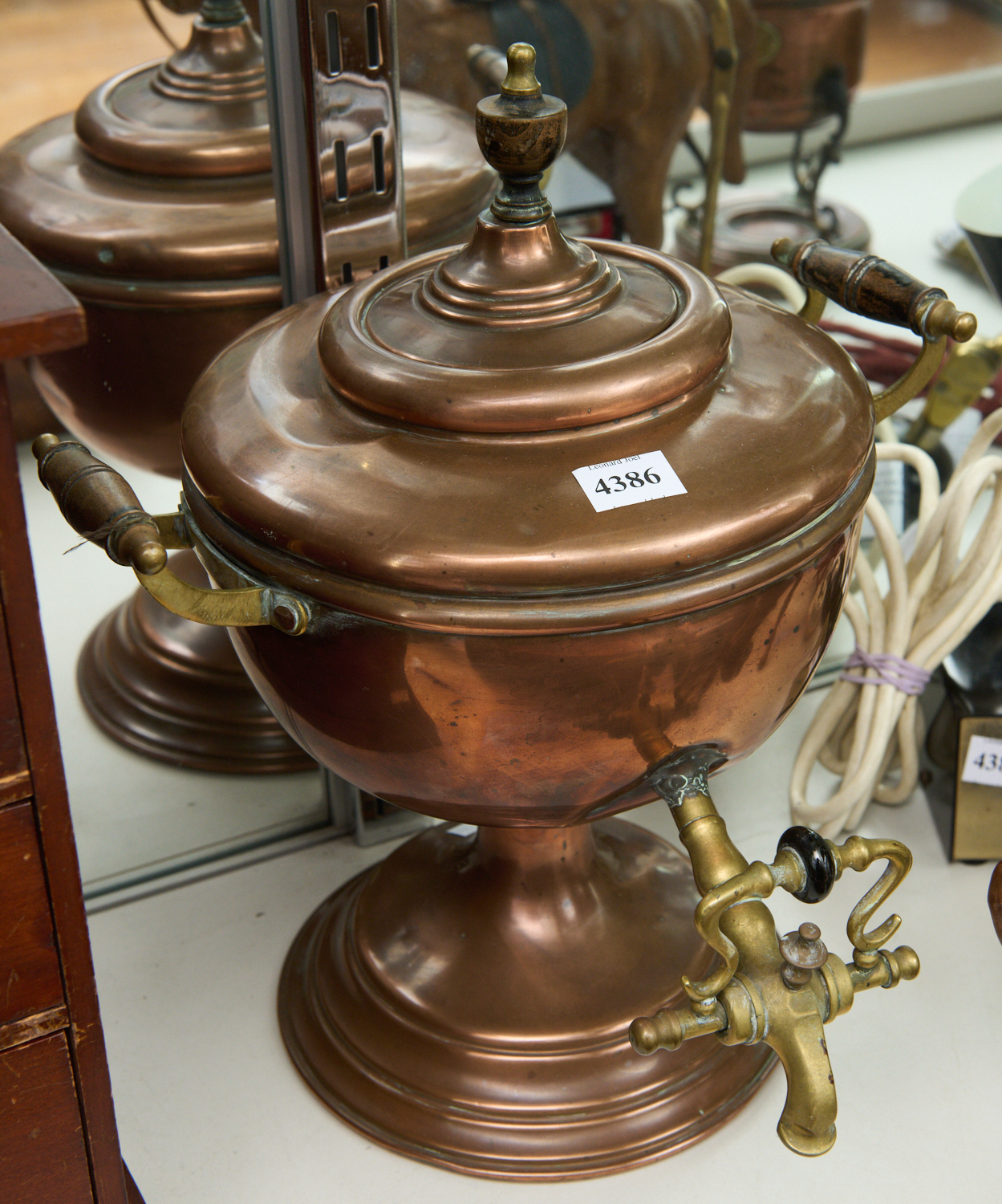A COPPER WOODEN HANDLED SAMOVAR WITH BRASS TAP H.36CM, LEONARD JOEL LOCAL DELIVERY SIZE: SMALL