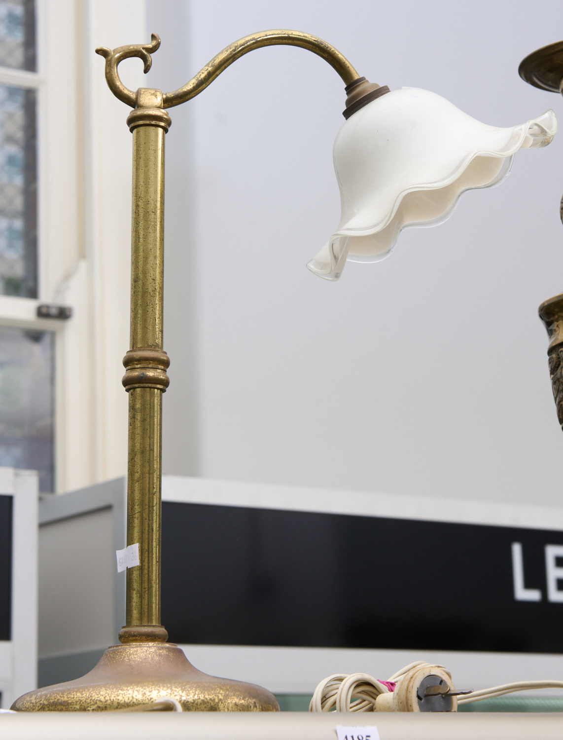 A BRASS DESK LAMP WITH GLASS SHADE H.41CM, LEONARD JOEL LOCAL DELIVERY SIZE: SMALL