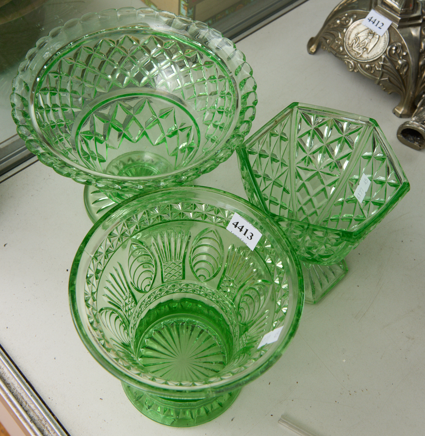 GROUP OF THREE DEPRESSION GLASS GREEN FLUTED VASES H.15CM, LEONARD JOEL LOCAL DELIVERY SIZE: SMALL