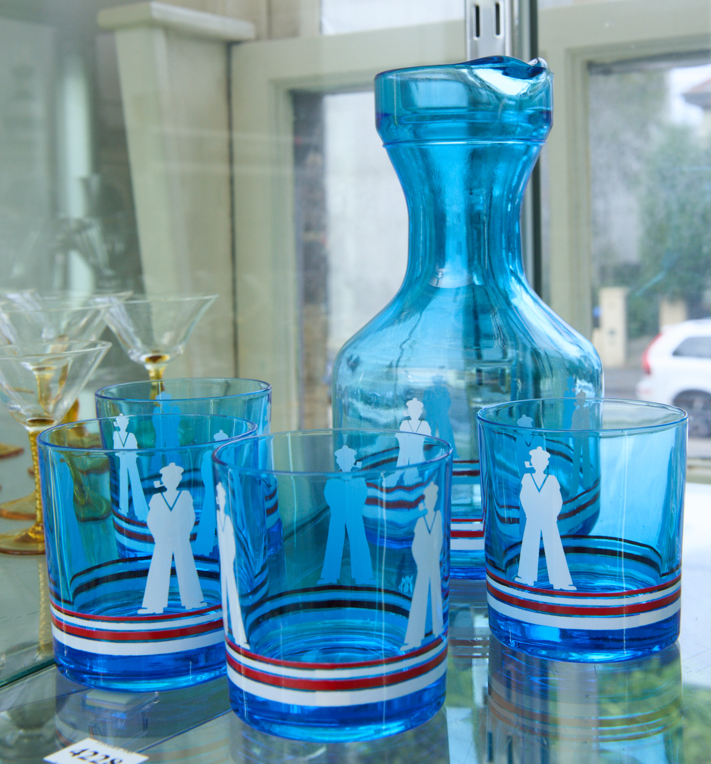 A BLUE GLASS DECANTER AND MATCHED TUMBLERS WITH SAILOR ENAMEL MOTIF, LEONARD JOEL LOCAL DELIVERY SIZE: SMALL