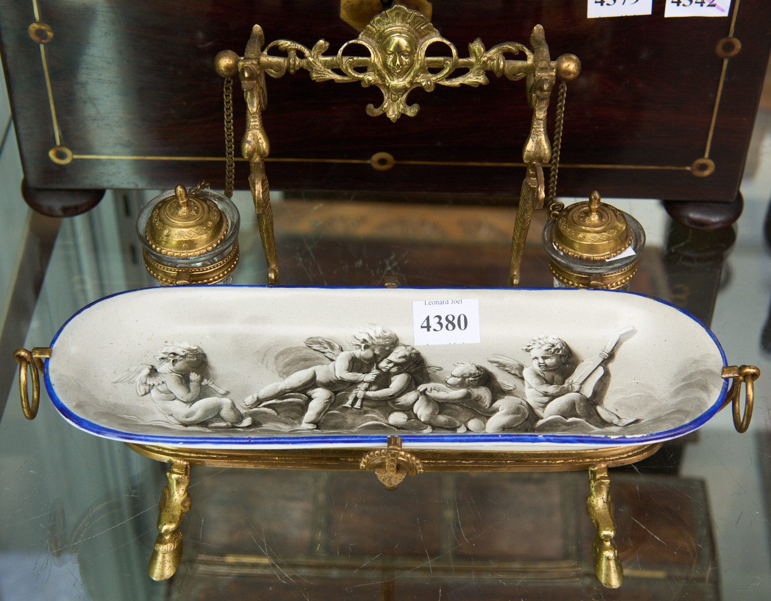 A FRENCH BRONZE & PORCELAIN DOUBLE INKWELL STAND W.26CM, LEONARD JOEL LOCAL DELIVERY SIZE: SMALL