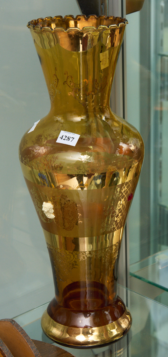 AN ITALIAN GILT DECORATED AMBER GLASS VASE WITH RAISED CAMEO MOTIFS H.42CM, LEONARD JOEL LOCAL DELIVERY SIZE: SMALL