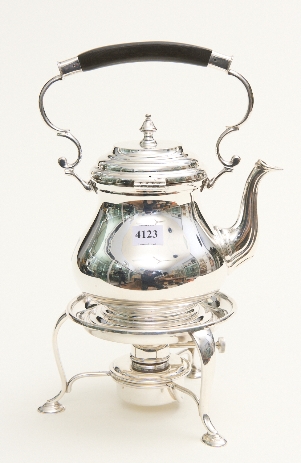 ROBERTS & BELK ENGLISH SHEFFIELD PLATED SPIRIT KETTLE ON STAND WITH BURNER H.34CM, LEONARD JOEL LOCAL DELIVERY SIZE: SMALL