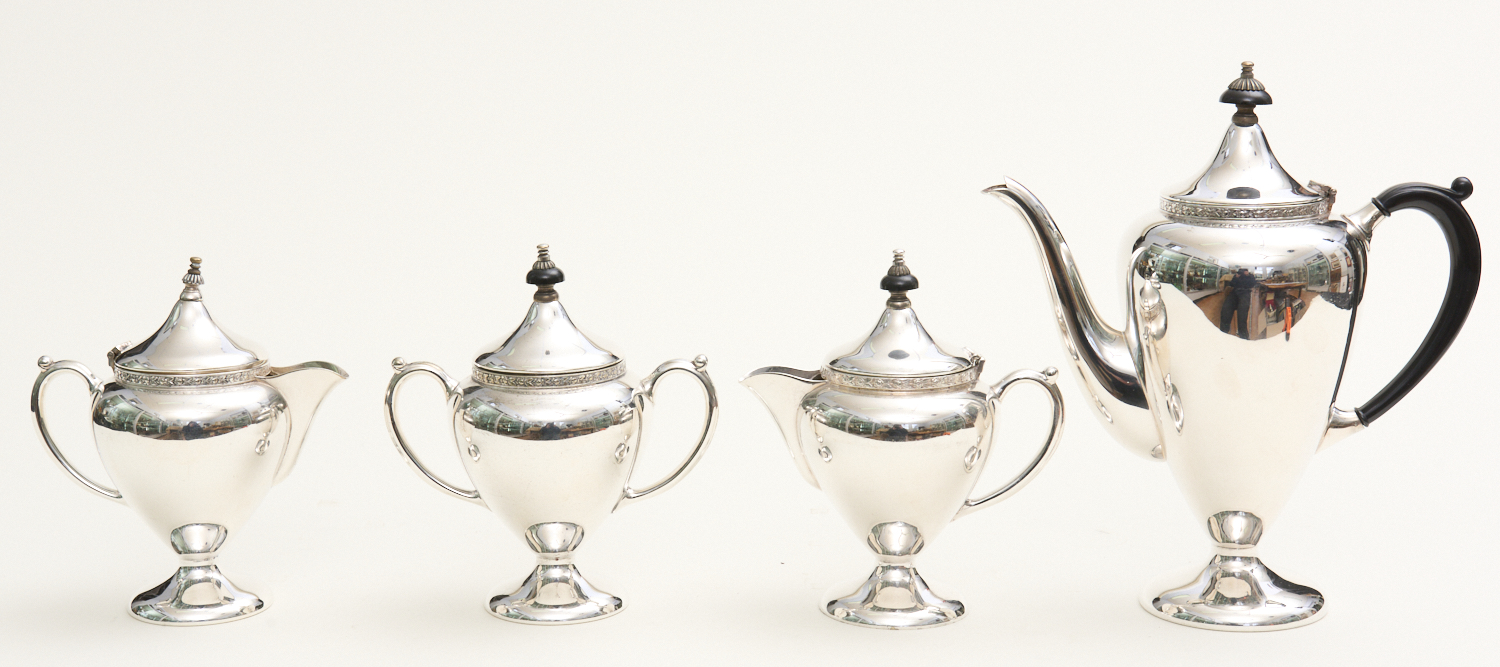 A 1920S FOUR PIECE SILVER PLATED TEA SERVICE, LEONARD JOEL LOCAL DELIVERY SIZE: SMALL