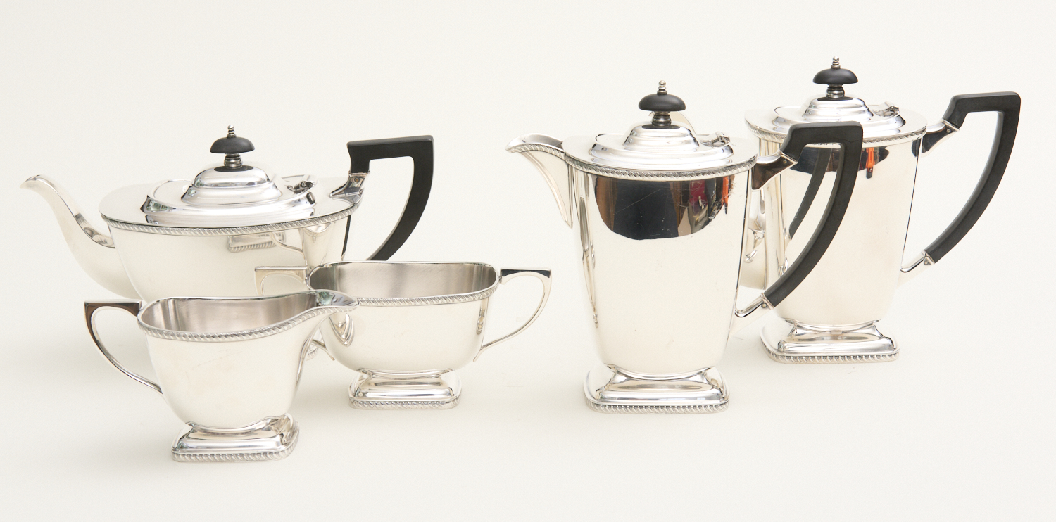 A 1940S FIVE PIECE SILVER PLATE TEA AND COFFEE SERVICE, LEONARD JOEL LOCAL DELIVERY SIZE: SMALL