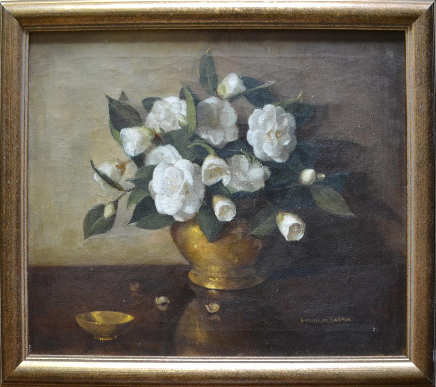 EVELYN BAXTER, STILL LIFE WITH GOLD VASE, OIL ON CANVAS, 49 X 57CM, FRAMED SIZE: 61 X 69CM, LEONARD JOEL DELIVERY SIZE: MEDIUM