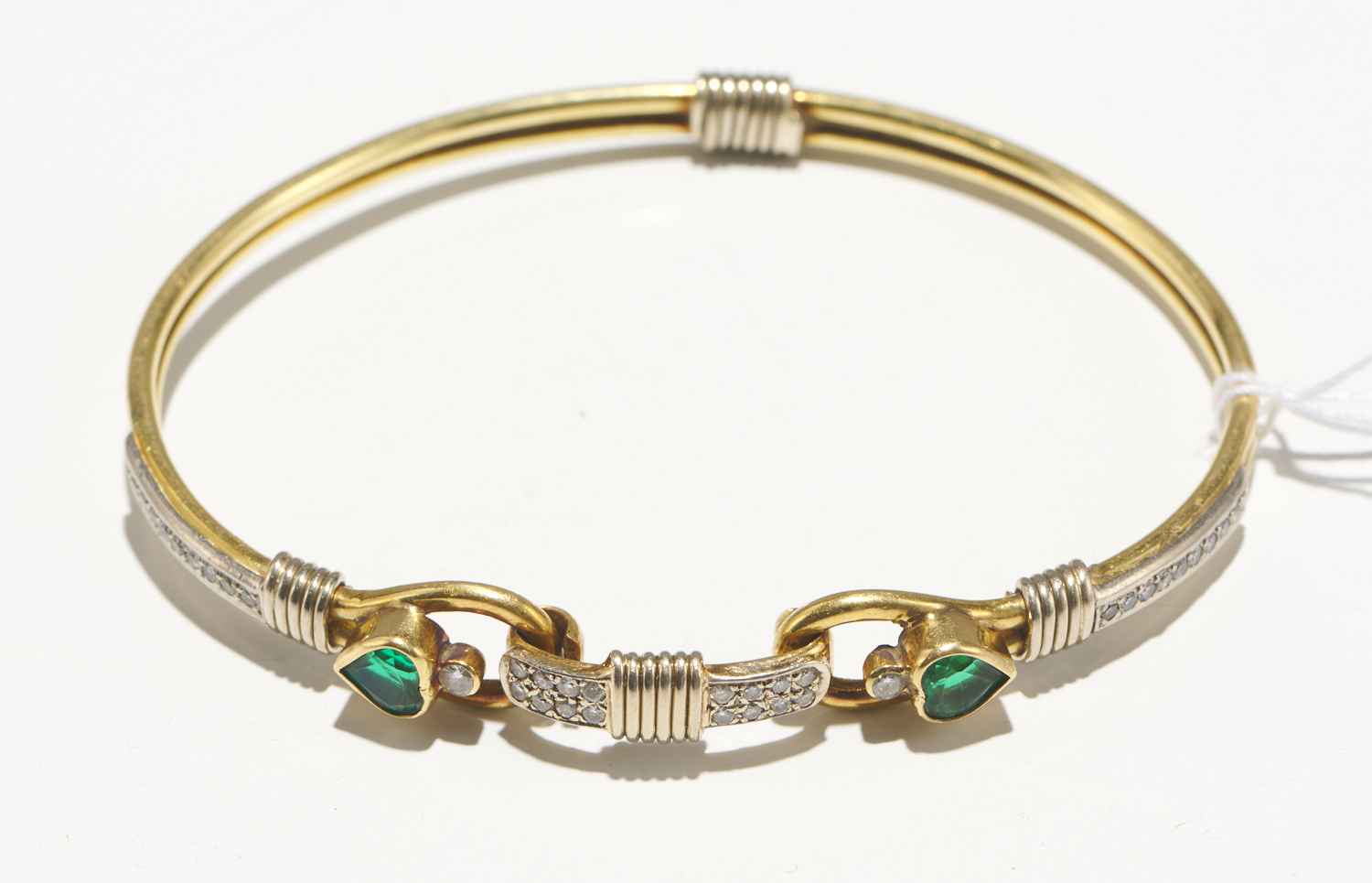 A SYNTHETIC EMERALD AND DIAMOND BANGLE IN 18CT GOLD