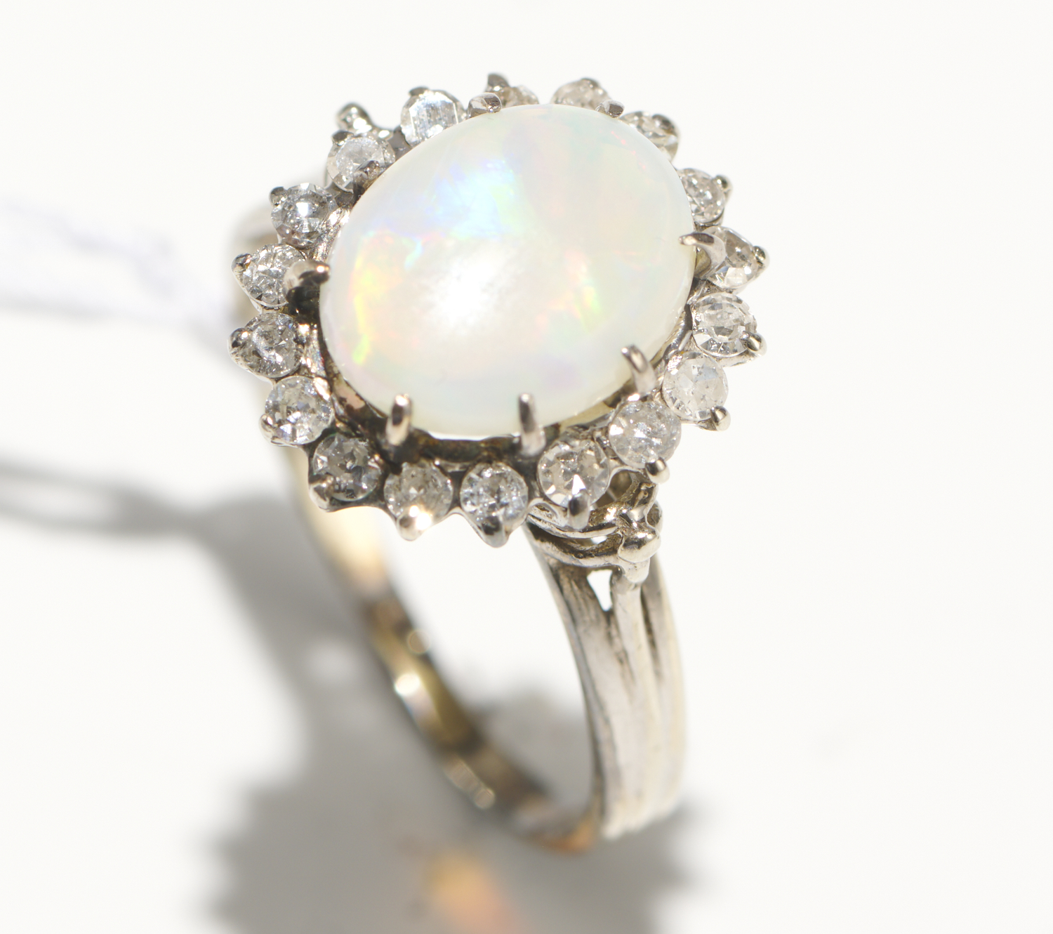 AN OPAL AND DIAMOND RING IN WHITE GOLD, SIZE O