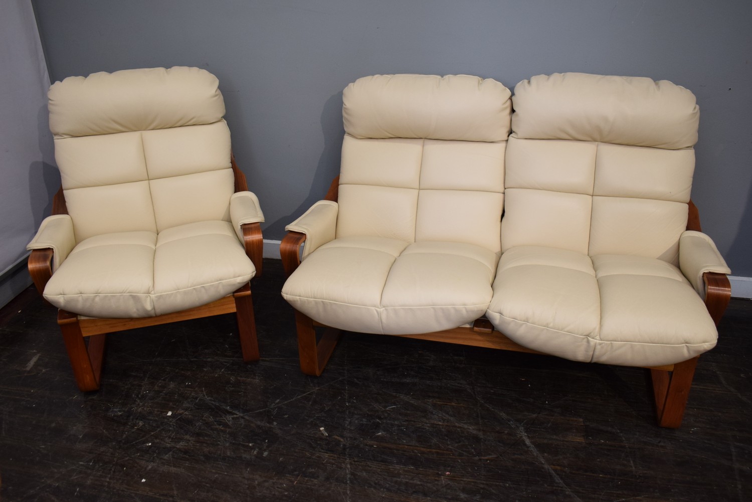 A TWO SEATER TESSA SOFA AND MATCHING ARMCHAIR IN CREAM LEATHER (H92 X W143 X D96 CM) (LEONARD JOEL DELIVERY SIZE: LARGE)
