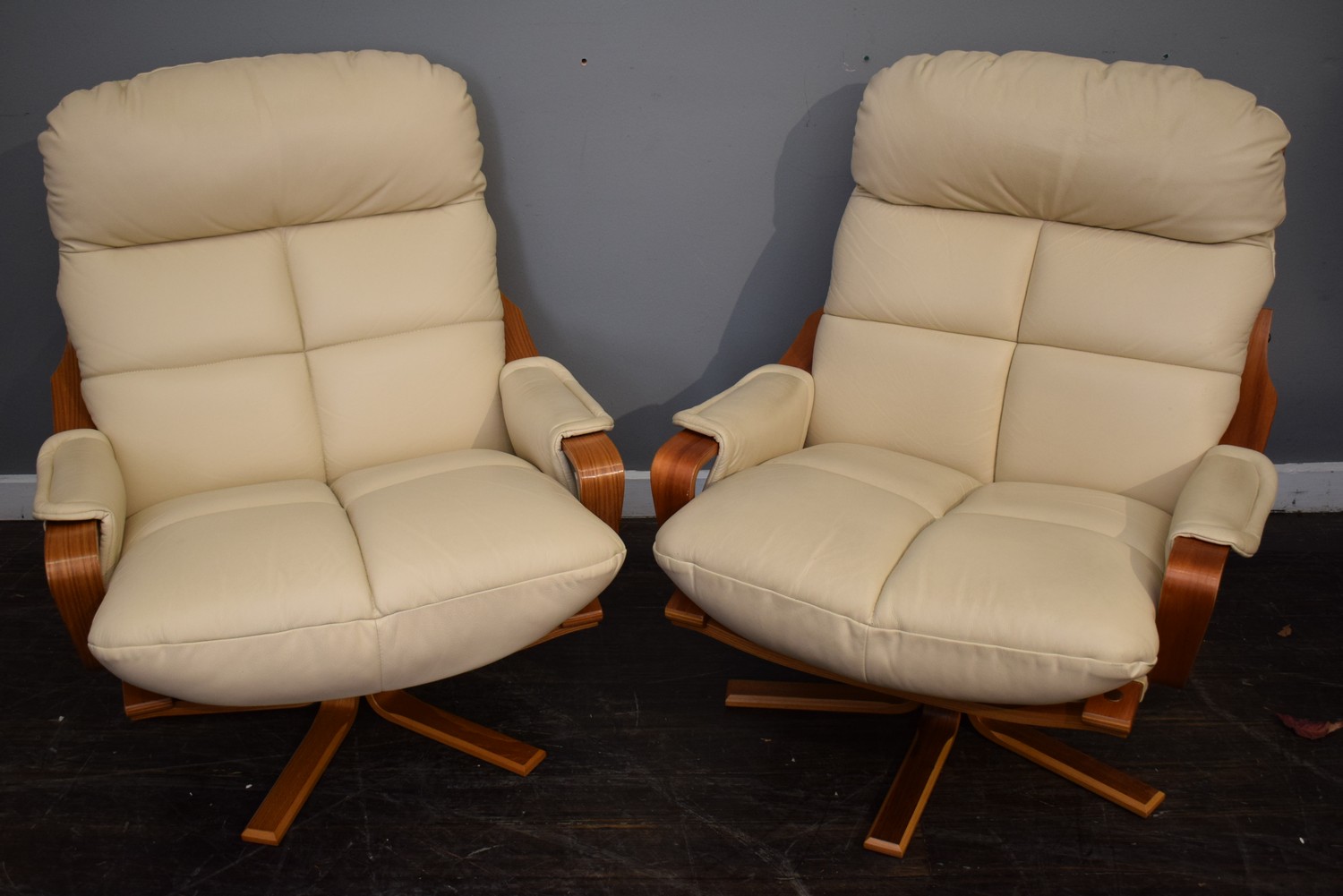 A PAIR OF TESSA ARMCHAIRS ON SWIVEL BASES IN CREAM LEATHER (H92 X W80 X D91 CM) (LEONARD JOEL DELIVERY SIZE: LARGE)