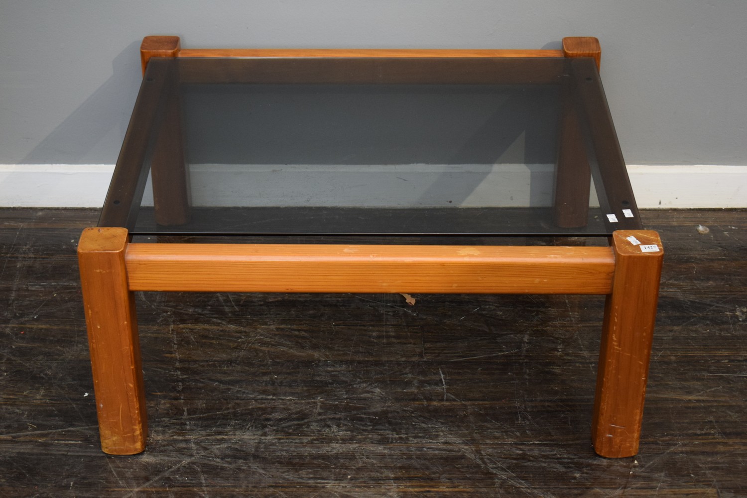 A MID-CENTURY TIMBER AND GLASS COFFEE TABLE (A/F) (H39 X W85 X D85 CM) (LEONARD JOEL DELIVERY SIZE: LARGE)