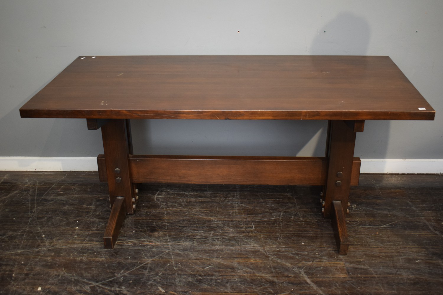 A TIMBER TABLE WITH STRETCHER BASE (A/F) (H74 X W168 X D79 CM) (PLEASE NOTE THIS HEAVY ITEM MUST BE REMOVED BY CARRIERS AT THE CUSTOMER'S EXPENSE. LEONARD JOEL STAFF CANNOT ASSIST CARRYING THIS ITEM) (X-LARGE ITEM)