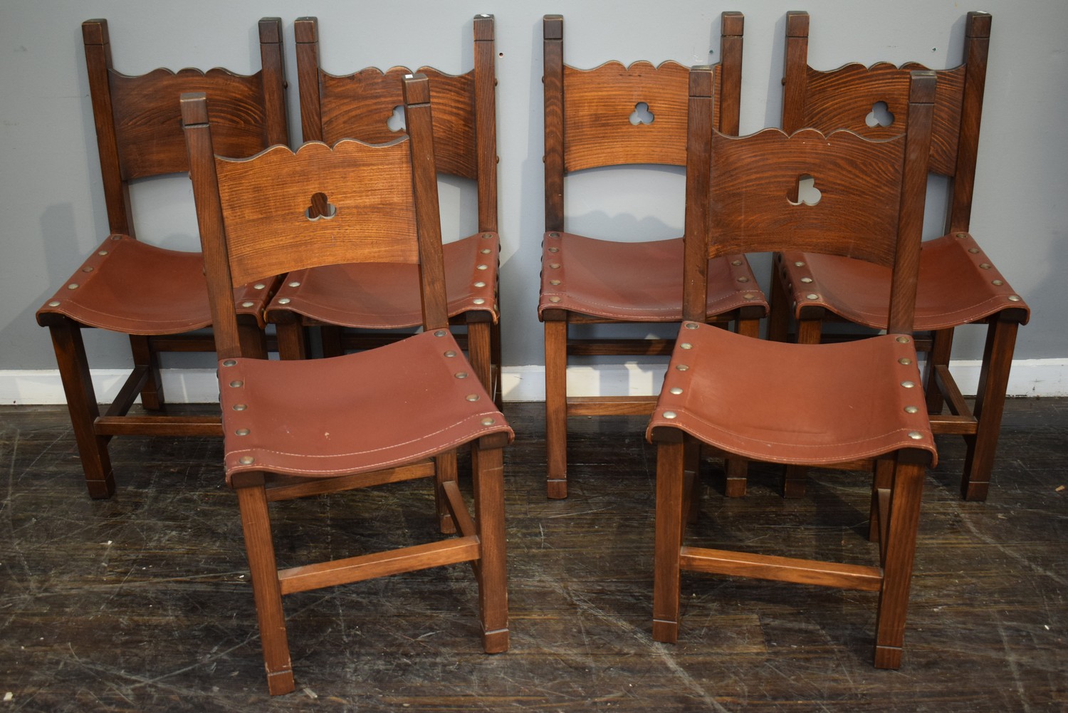 A SET OF SIX TIMBER AND LEATHER DINING CHAIRS BY DAVID FURNITURE (H94 X W47 X D48 CM) (LEONARD JOEL DELIVERY SIZE: LARGE)