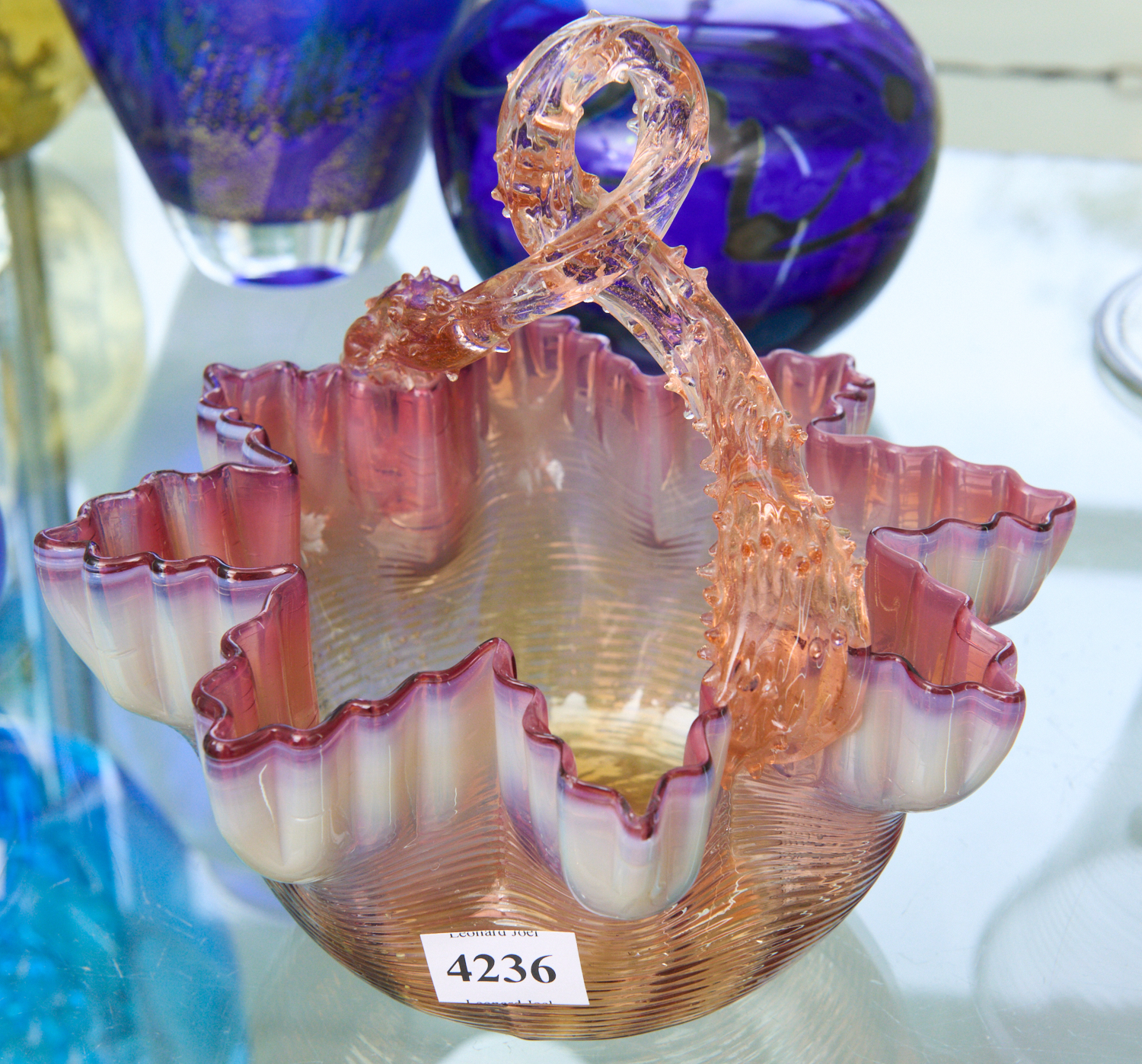 A PINK GLASS DISH WITH TWISTED THORN HANDLE, LEONARD JOEL LOCAL DELIVERY SIZE: SMALL