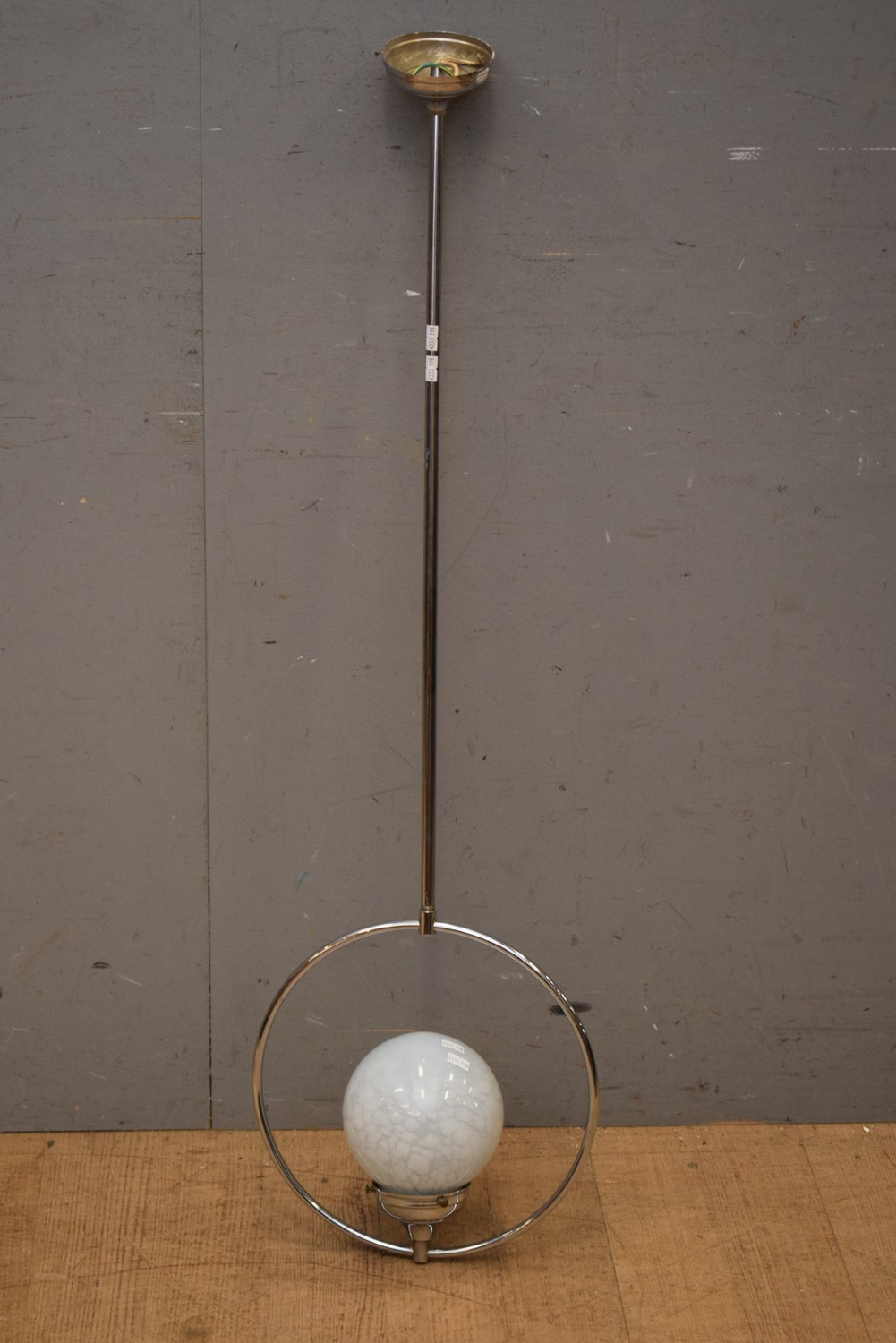 A 1930s ART DECO CHROME CEILING LIGHT WITH ORIGINAL MOTTLED BLUE GLASS SHADE (110H X 31W CM) (LEONARD JOEL DELIVERY SIZE: MEDIUM)