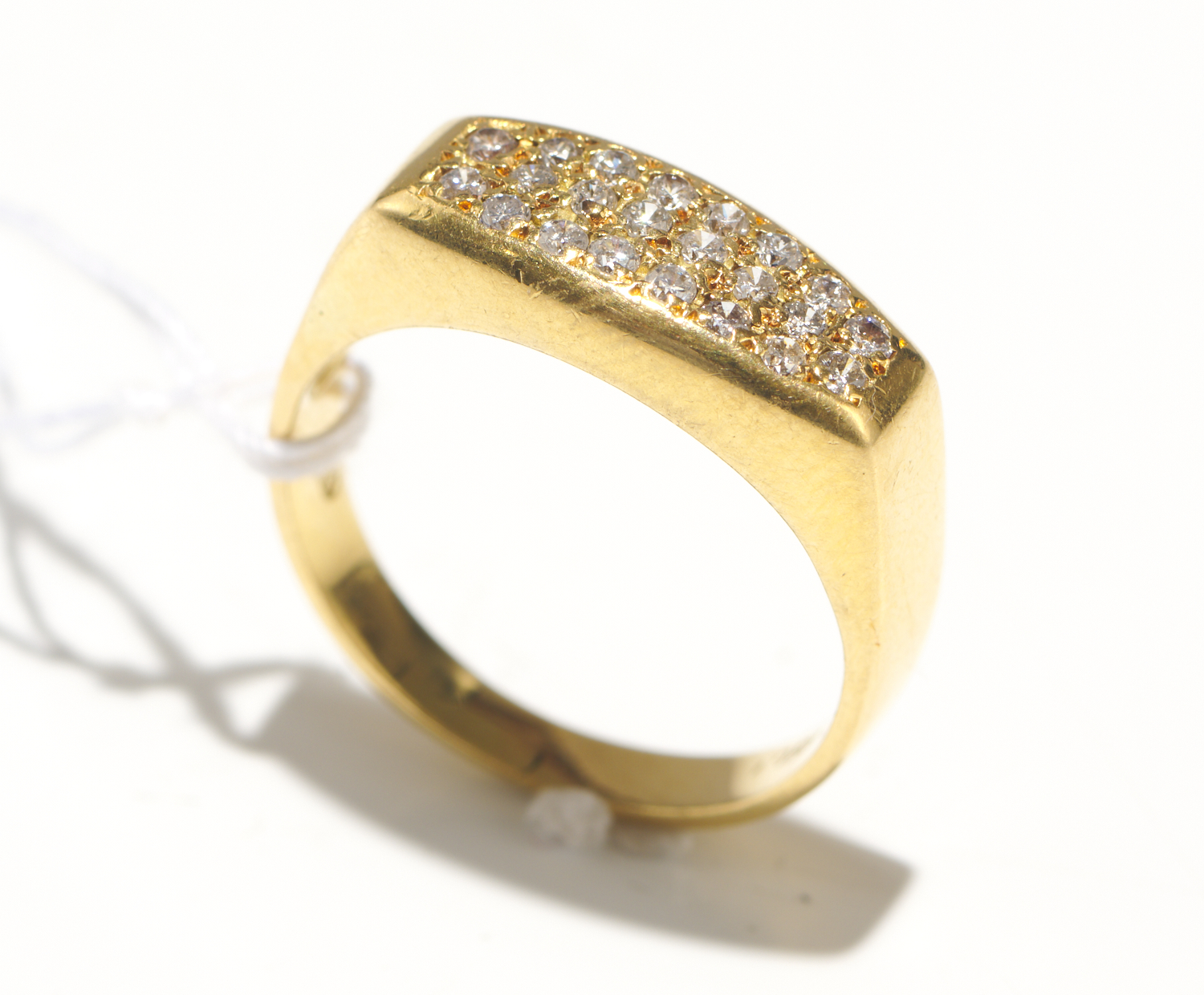A DIAMOND SET SIGNET RING IN 18CT GOLD, TOTAL WEIGHT 5.8GMS