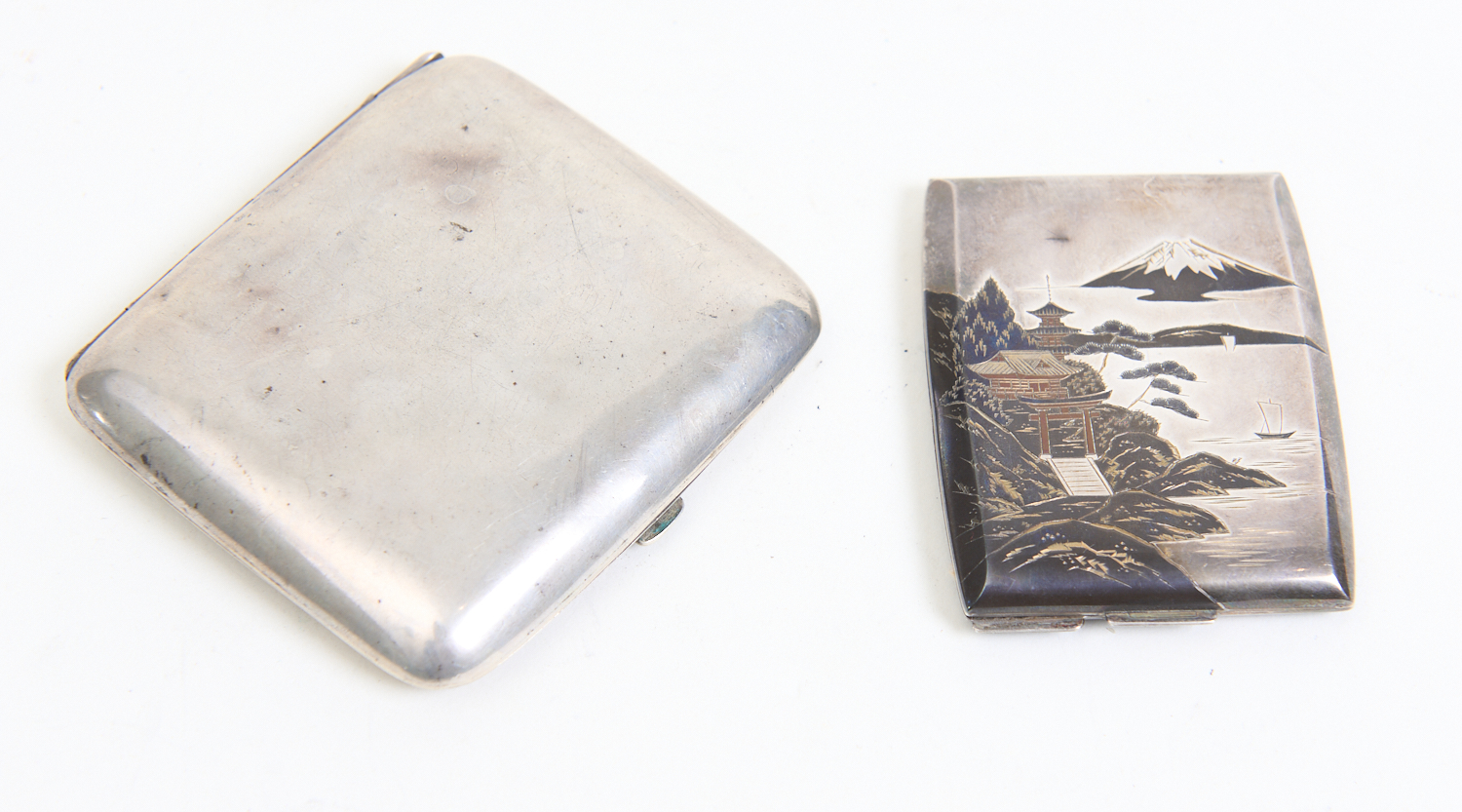 A SMALL KOMAI DECORATED SILVER COMPACT AND A SILVER CASE (NOT MARKED) H.8CM, LEONARD JOEL LOCAL DELIVERY SIZE: SMALL