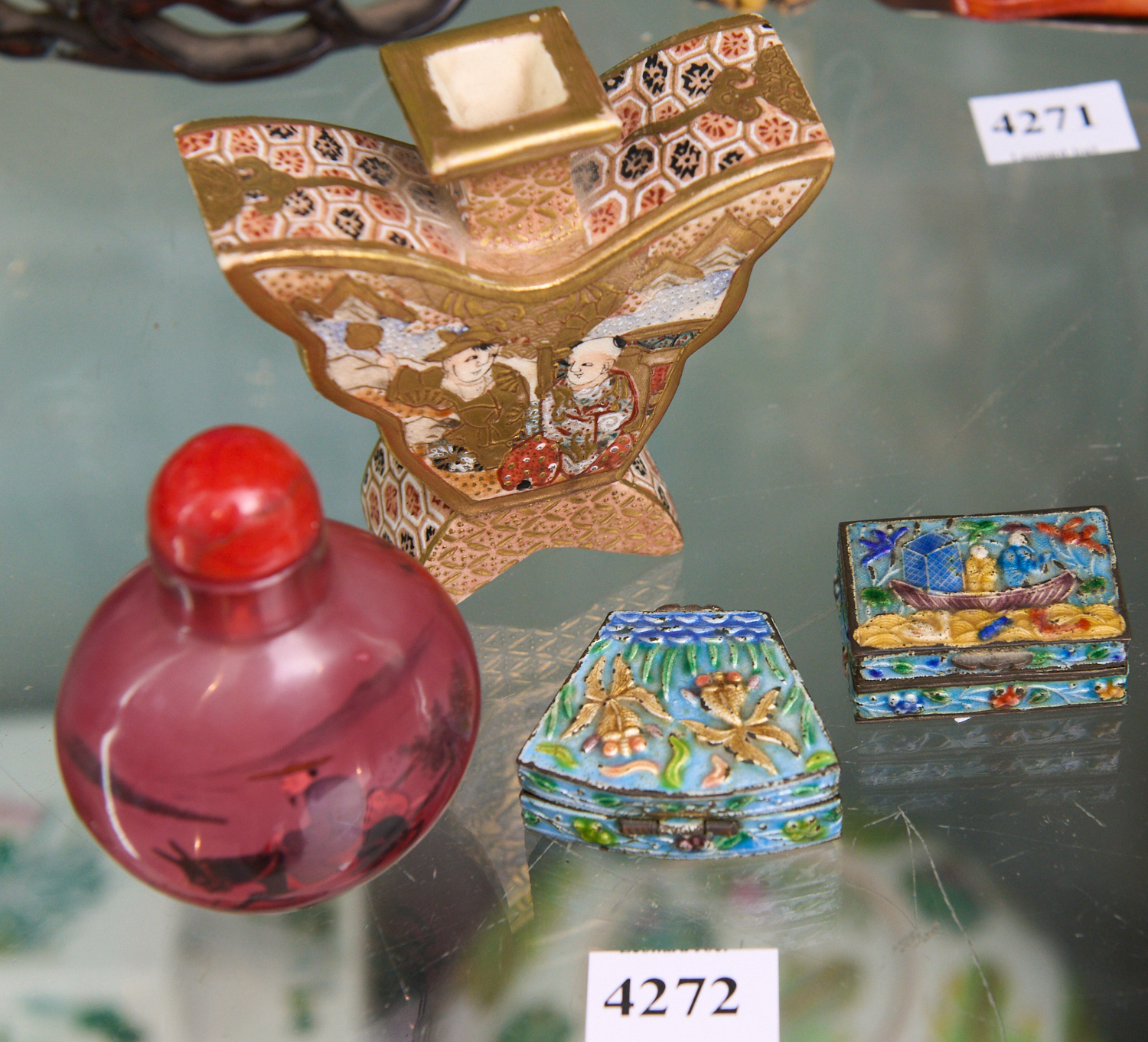 A BUTTERFLY FORM SATSUMA VASE, CHINESE SNUFF BOTTLE AND TWO MINIATURE CHINESE ENAMEL BOXES, LEONARD JOEL LOCAL DELIVERY SIZE: SMALL