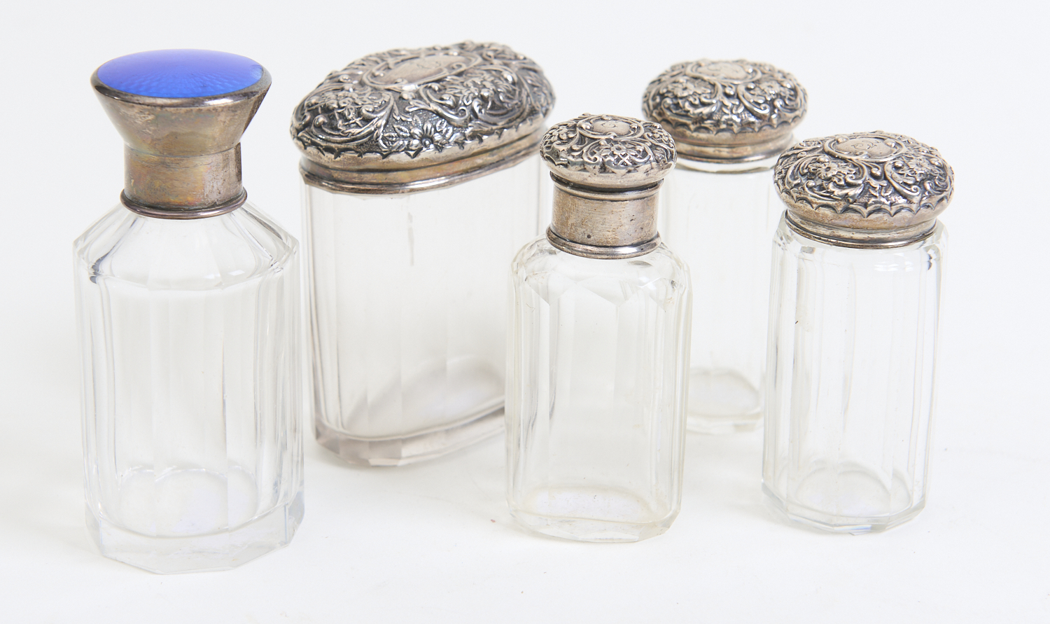 FIVE STERLING SILVER MOUNTED DRESSING TABLE BOTTLES, LEONARD JOEL LOCAL DELIVERY SIZE: SMALL