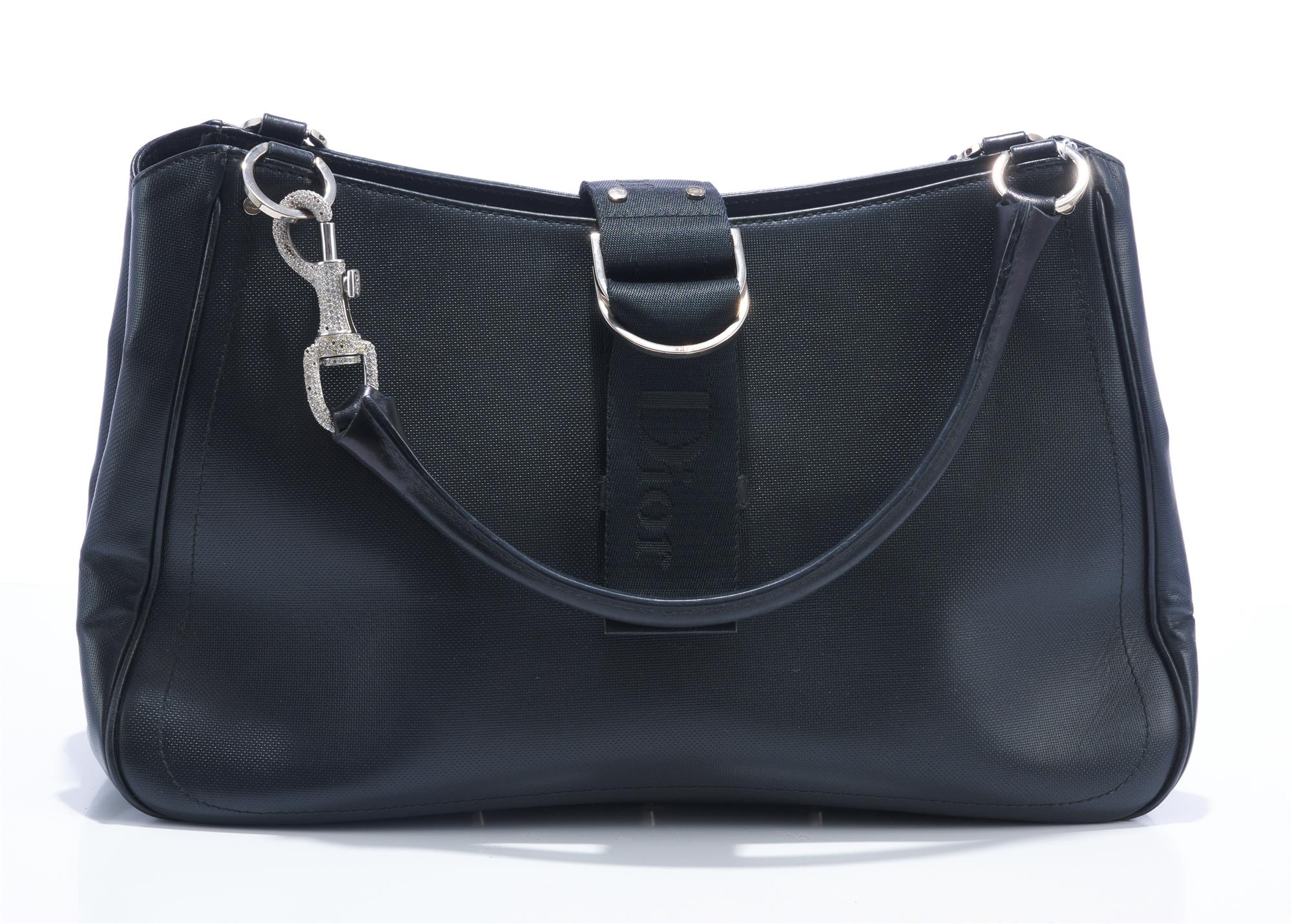 Styled in black coated canvas with black leather trim, grosgrain detail crystal set J-Clasp and silver tone metal hardware, 31 x 20 x 12cm.
