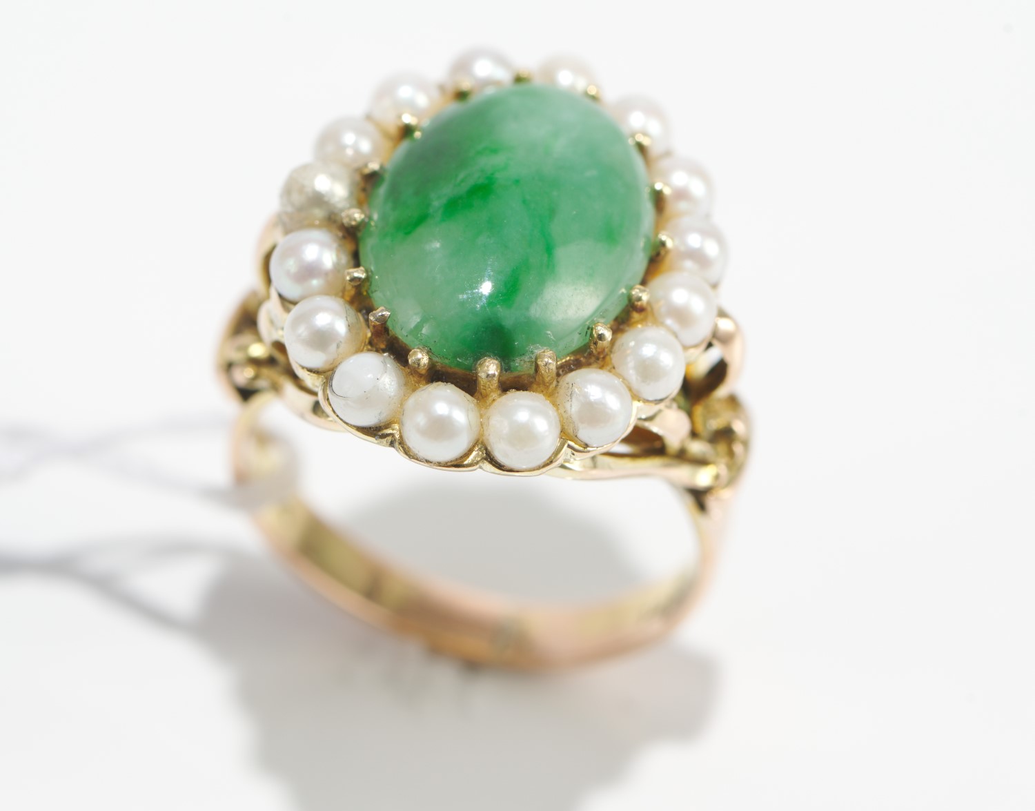 A JADE AND PEARL RING IN 14CT GOLD, SIZE K, 6.7GMS