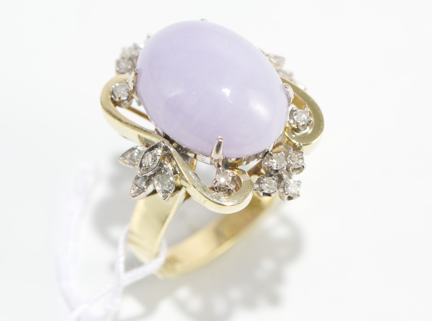 A LAVENDER JADE AND DIAMOND RING IN 14CT GOLD, SIZE M