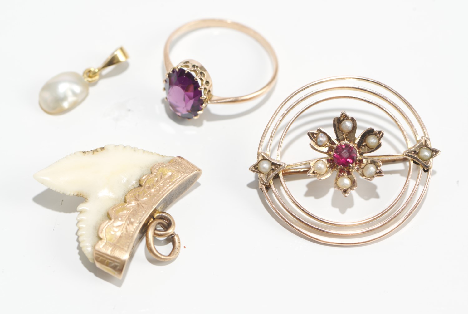 AN EDWARDIAN RUBY AND PEARL BROOCH, ALONG WITH AN AMETHYST SET RING IN 9CT GOLD (RING SIZE J/K, 1.6GMS), A PEARL PENDANT AND ANTIQUE SHARK TOOTH PENDANT