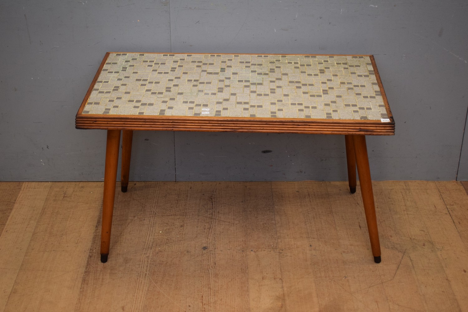 A MID-CENTURY TILE TOP COFFEE TABLE (A/F) (H56 X W95 X D54 CM) (LEONARD JOEL DELIVERY SIZE: LARGE)