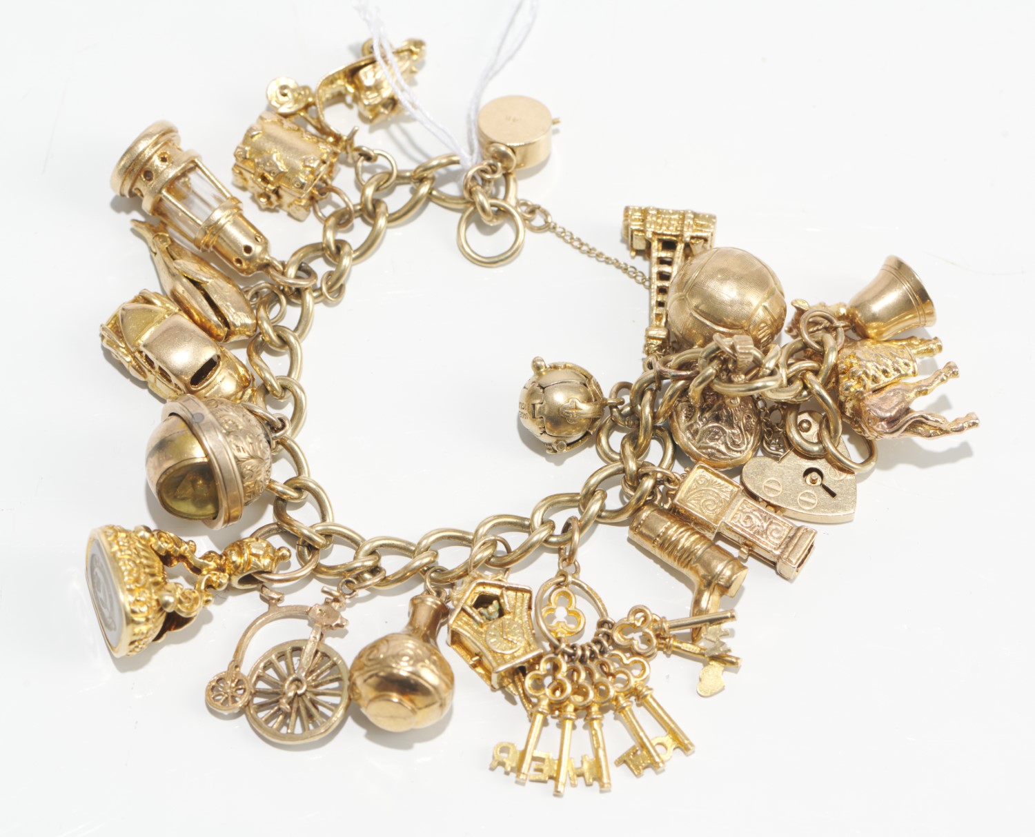 A CHARM BRACELET IN 9CT GOLD, SOME CHARMS IN 9CT GOLD, 73.4GRAMS, TOTAL LENGTH 20CM