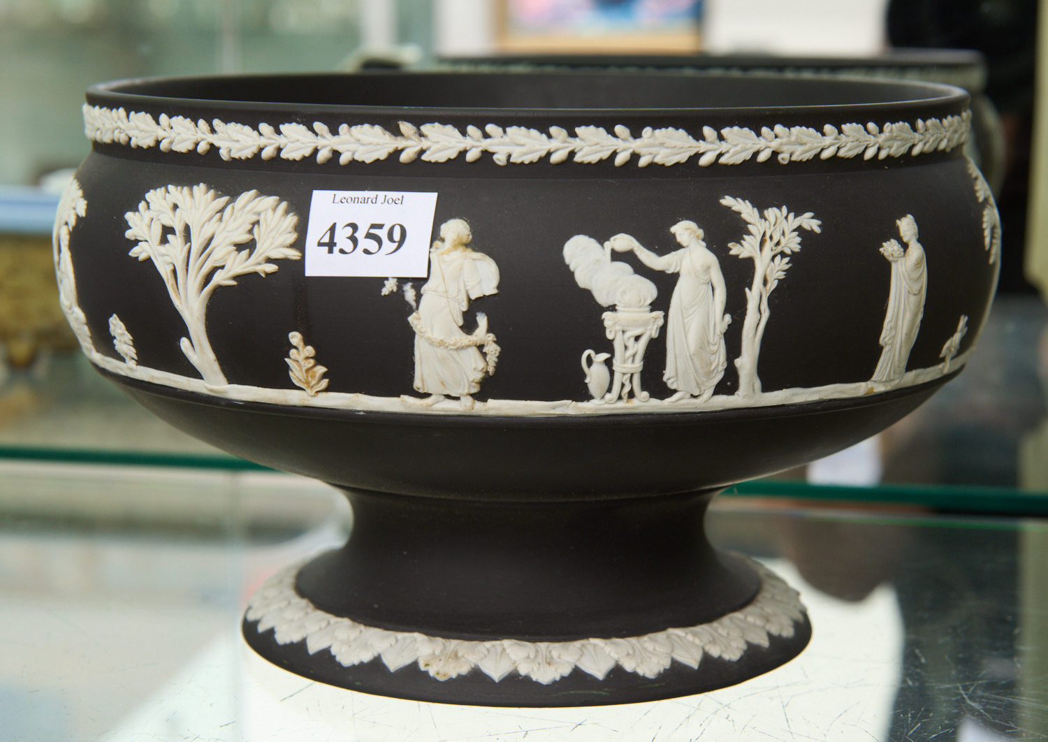 A WEDGWOOD BLACK BASALT JASPERWARE FOOTED BOWL (20 CM D), LEONARD JOEL LOCAL DELIVERY SIZE: SMALL