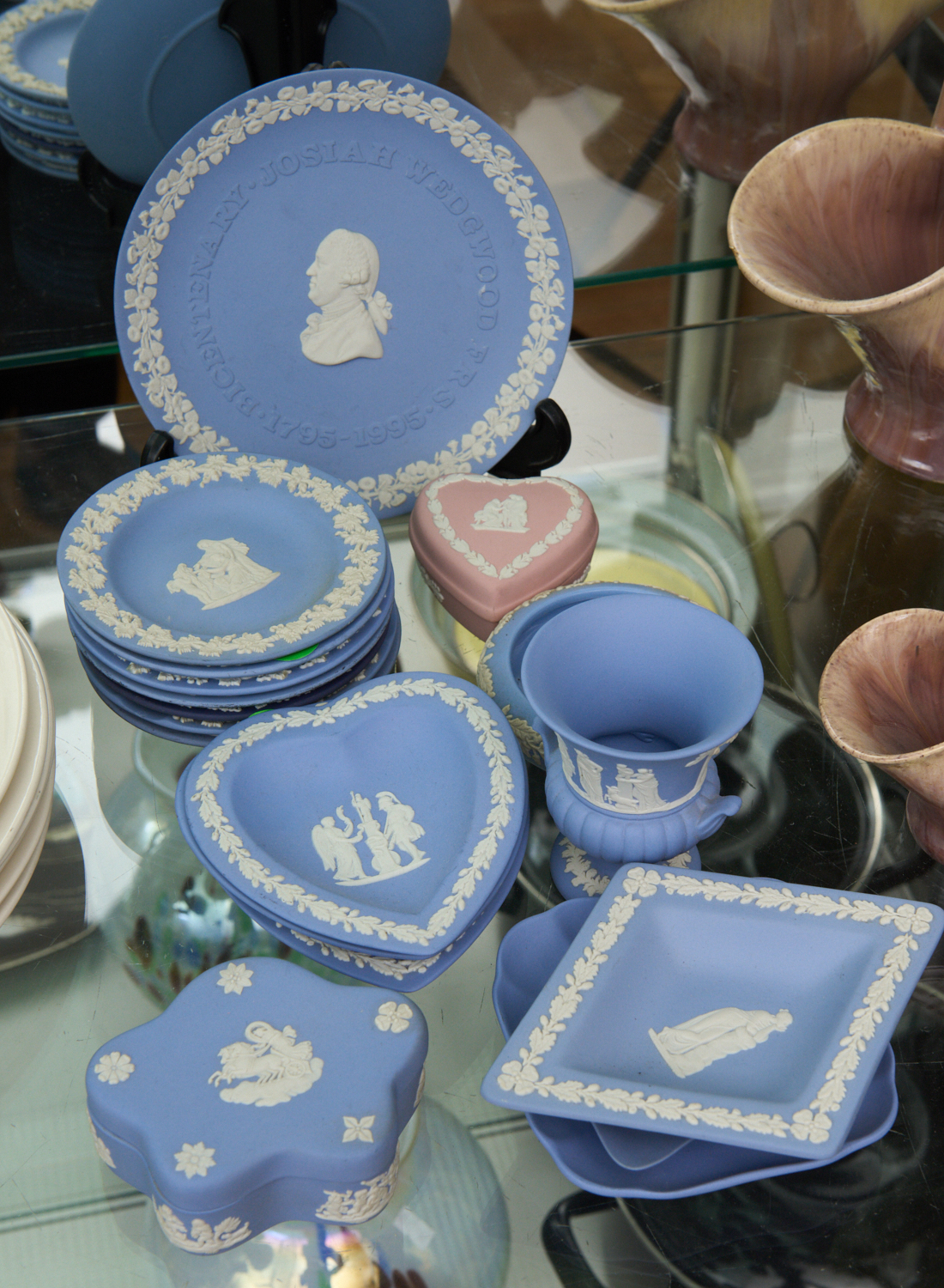 A GROUP OF BLUE WEDGWOOD JASPERWARE ITEMS TOGETHER WITH PINK HEART SHAPED BOX, LEONARD JOEL LOCAL DELIVERY SIZE: SMALL