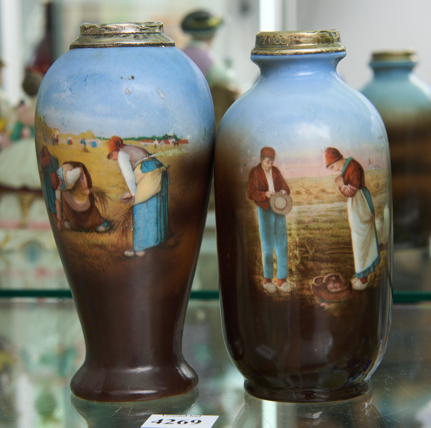A PAIR OF ANTIQUE STERLING SILVER TOPPED PORCELAIN VASES (14 CM H), LEONARD JOEL LOCAL DELIVERY SIZE: SMALL