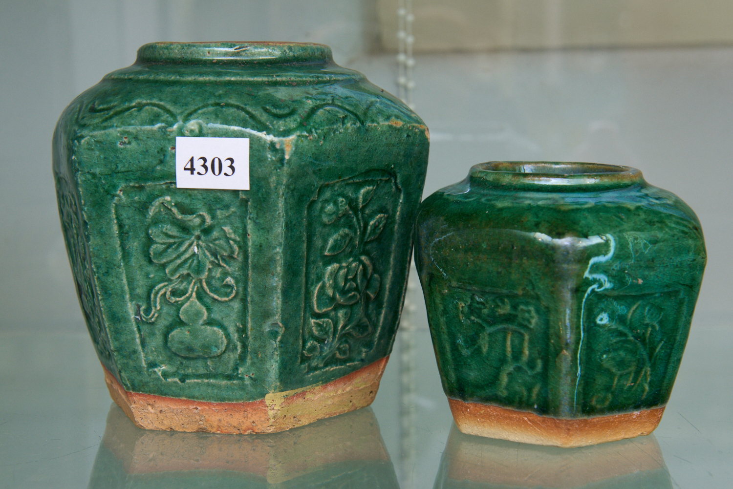 A PAIR OF CHINESE TURQUOISE GLAZED HEXAGONAL POTS (15 CM H), LEONARD JOEL LOCAL DELIVERY SIZE: SMALL