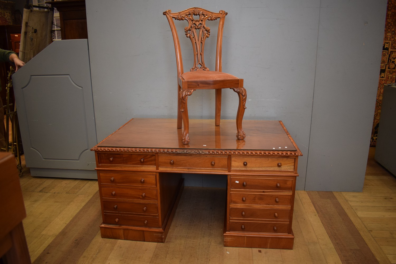 A SUBSTANTIAL PARTNERS DESK AND CHAIR (A/F) (H79 X W156 X D101 CM) (PLEASE NOTE THIS HEAVY ITEM MUST BE REMOVED BY CARRIERS AT THE CUSTOMER'S EXPENSE. LEONARD JOEL STAFF CANNOT ASSIST CARRYING THIS ITEM) (X-LARGE ITEM)