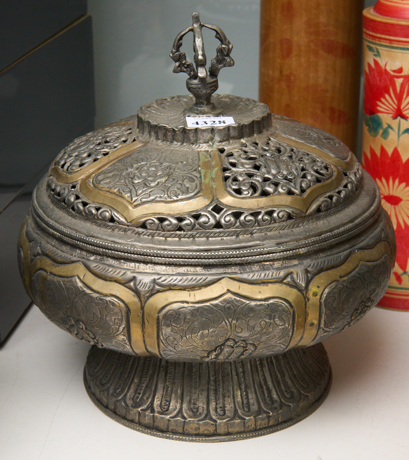 A TIBETIAN LIDDED URN WITH BRASS DECORATIONS (25 CM H), LEONARD JOEL LOCAL DELIVERY SIZE: SMALL