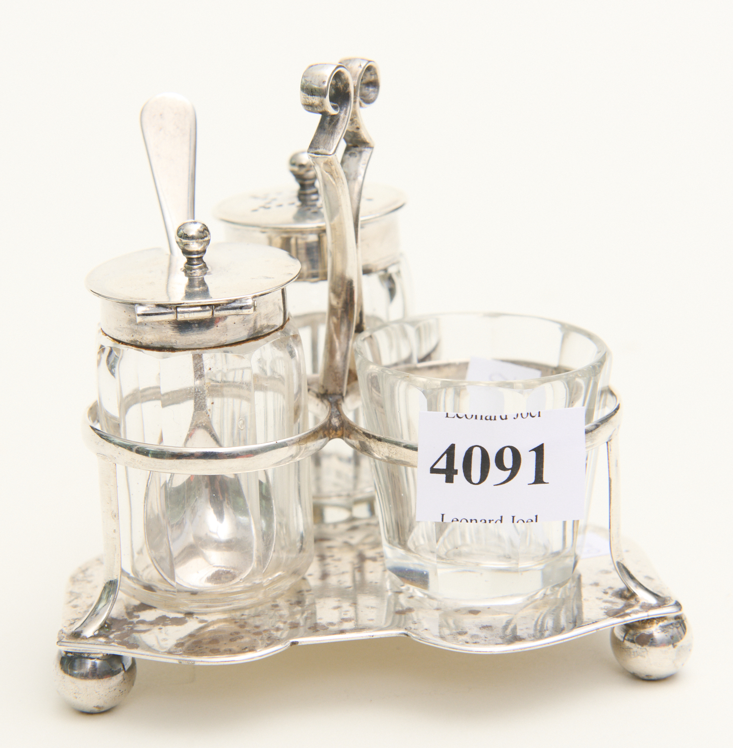 A STERLING SILVER CONDIMENT SET (SPOON EPNS), LEONARD JOEL LOCAL DELIVERY SIZE: SMALL