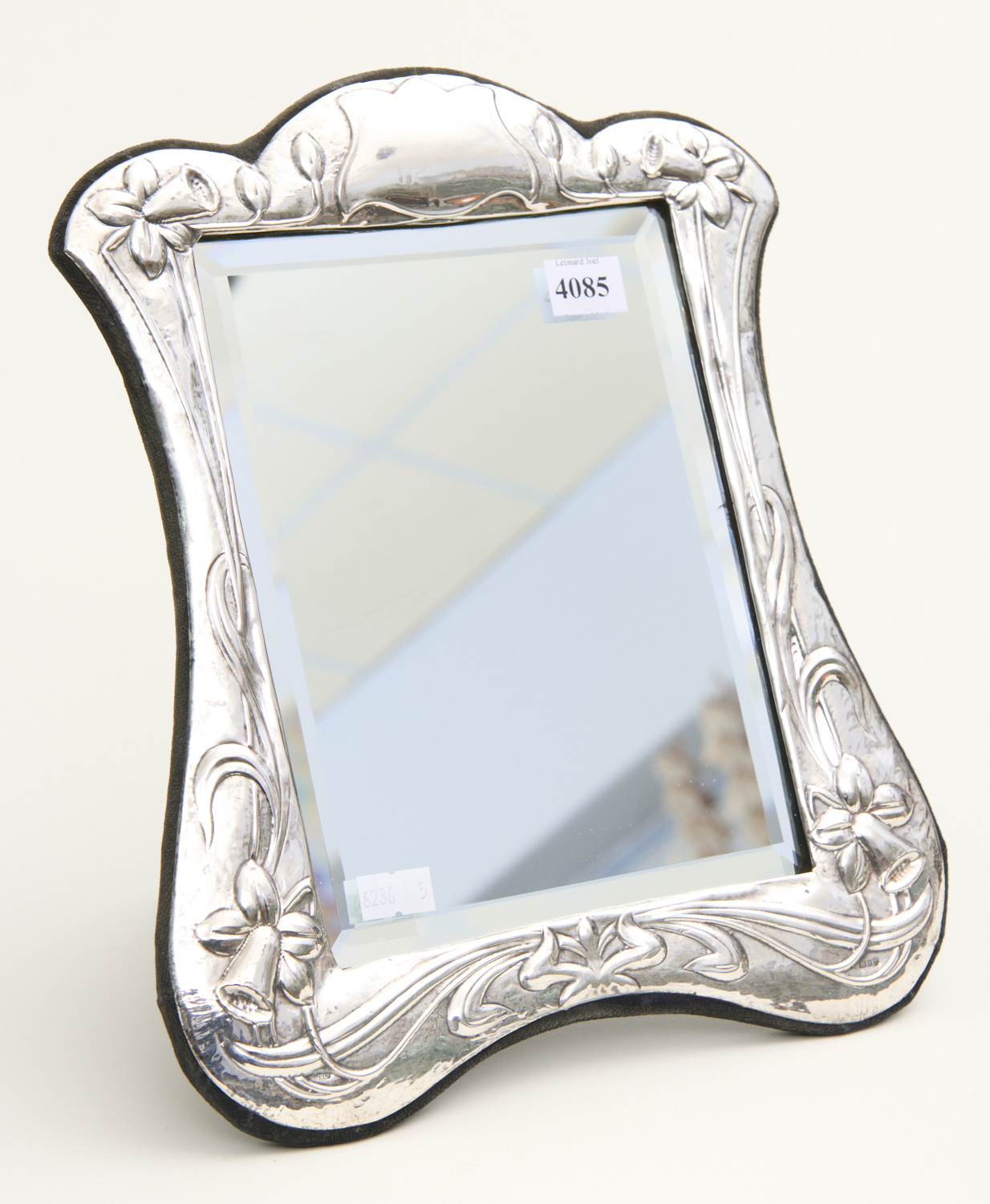 A STERLING SILVER ART NOUVEAU FRAMED TABLE MIRROR H.30CM, LEONARD JOEL LOCAL DELIVERY SIZE: SMALL