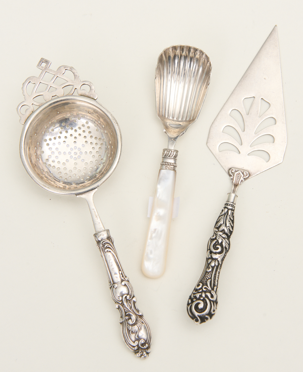 THREE ENGLISH SILVER COLLARED/HANDLED TEA SERVING ITEMS, LEONARD JOEL LOCAL DELIVERY SIZE: SMALL