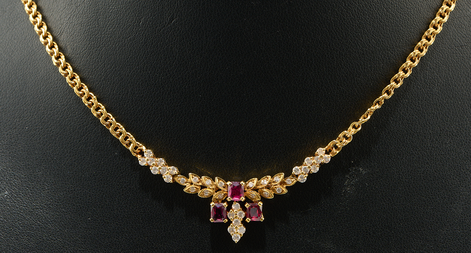 A RUBY AND DIAMOND PENDANT NECKLACE IN 18CT GOLD, TOTAL LENGTH 380MM, 12.0GMS