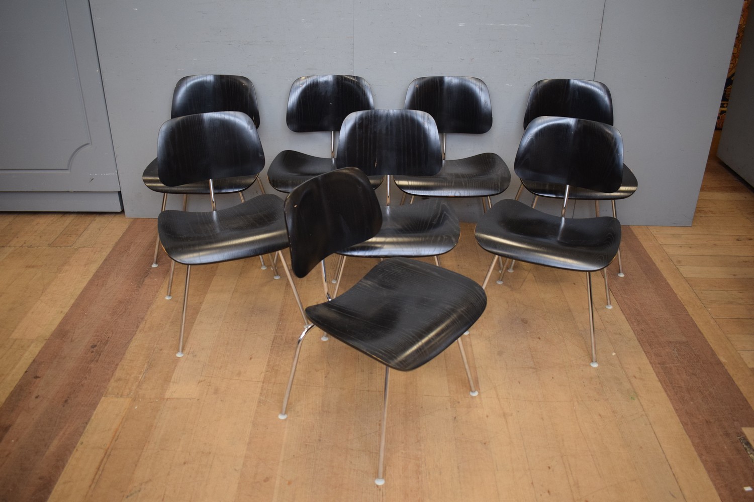 A SET OF EIGHT BLACK EAMES DCM DINING CHAIRS (A/F) (77H x 50W x 54D CM) (LEONARD JOEL DELIVERY SIZE: LARGE)