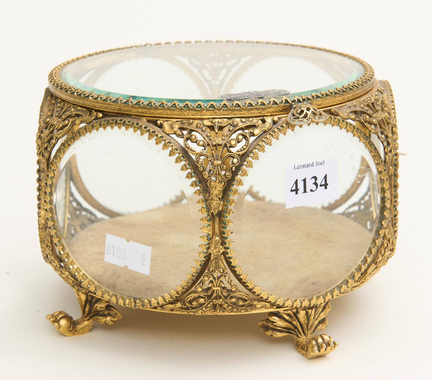 A GILT METAL AND BEVELLED GLASS TRINKET JEWELRY BOX DIA.14CM, LEONARD JOEL LOCAL DELIVERY SIZE: SMALL