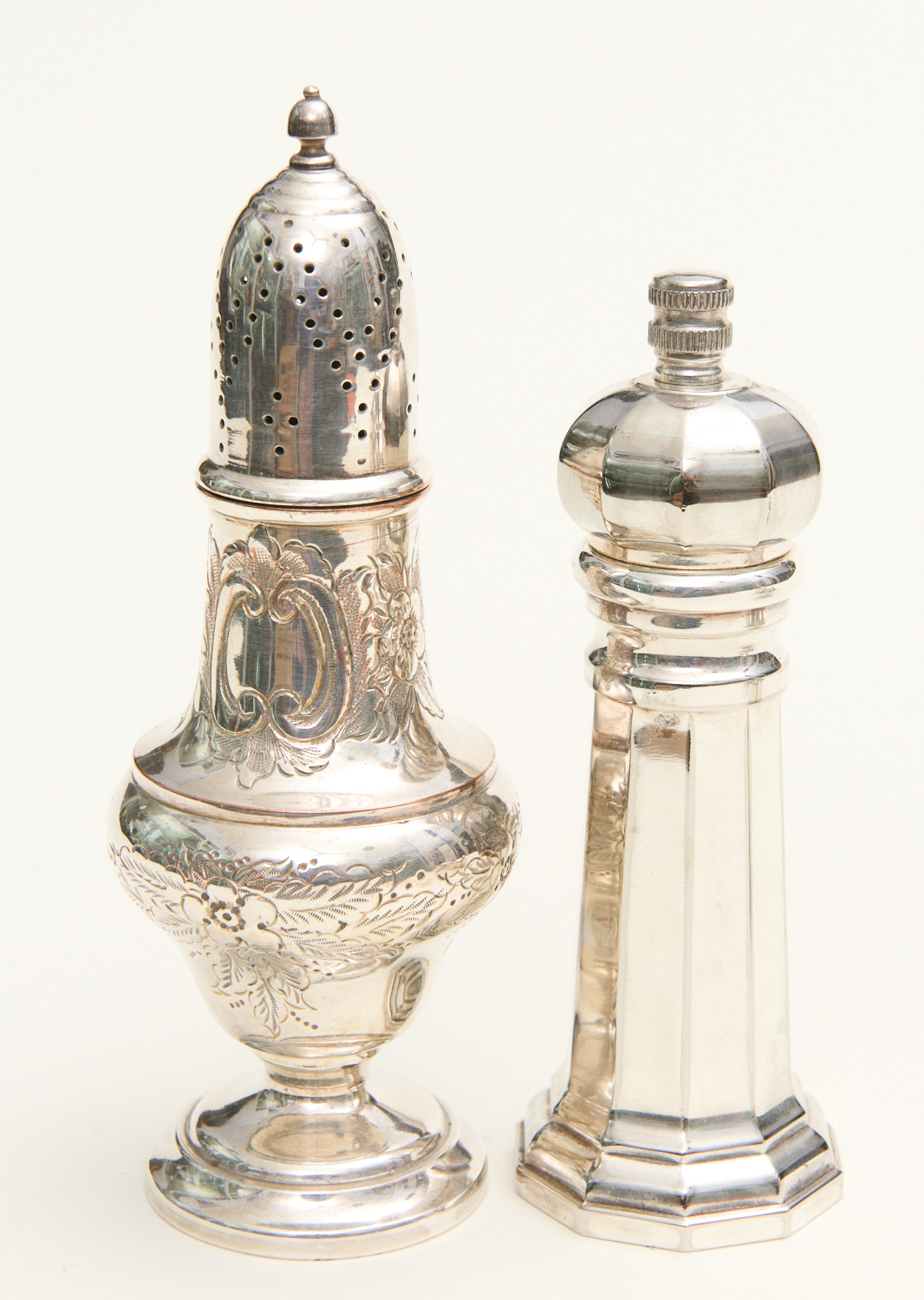 A SILVER PLATE SUGAR CASTOR AND PETER PIPER SILVERPLATED PEPPER MILL H.20CM, LEONARD JOEL LOCAL DELIVERY SIZE: SMALL