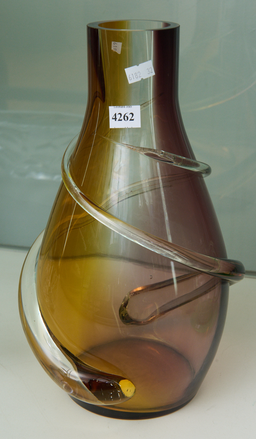 A 1960S ART GLASS VASE WITH DOUBLE TRAILING TO OUTSIDE IN AMBER AND PURPLE TONES, LEONARD JOEL LOCAL DELIVERY SIZE: SMALL