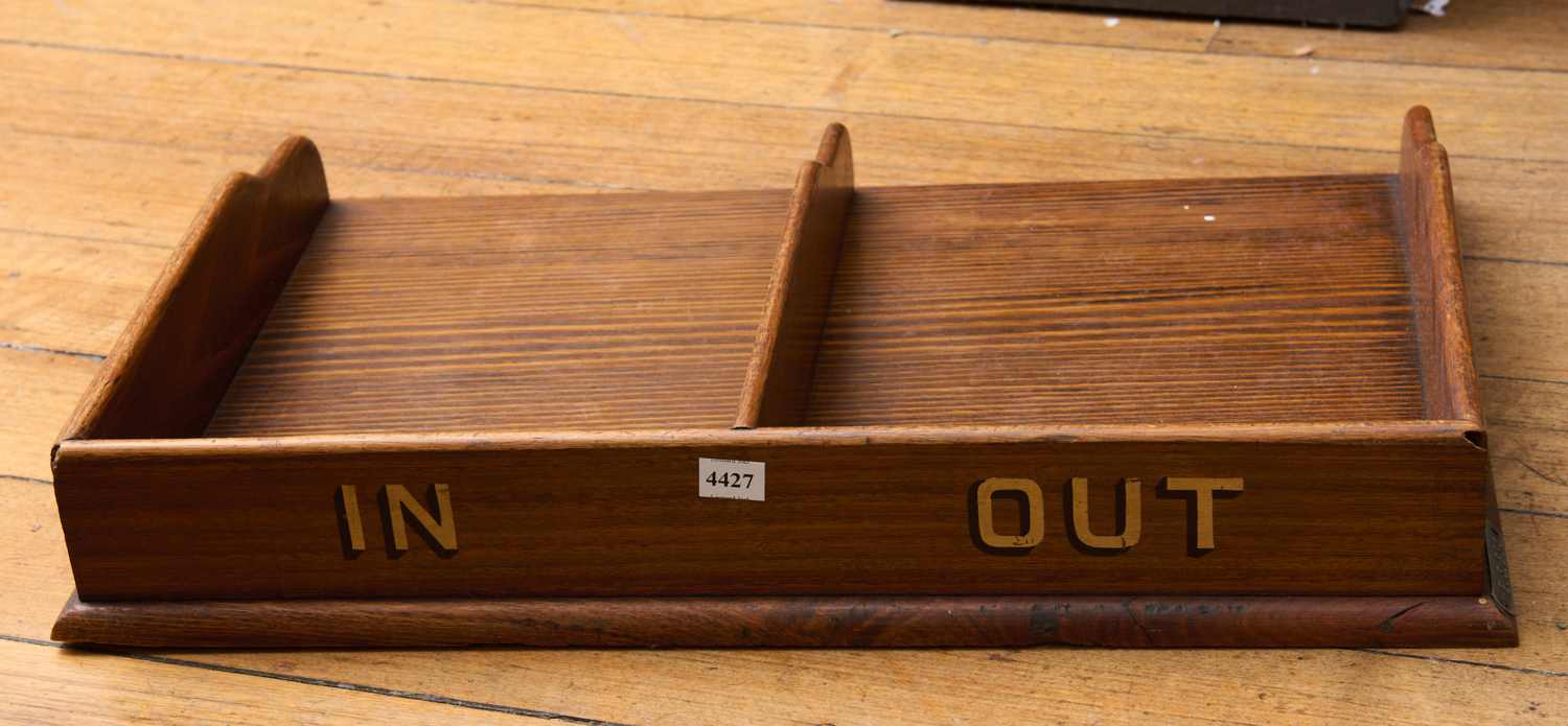 AN AUSTRALIAN GOVERNMENT OAK 'IN AND OUT' PAPER TRAY, LEONARD JOEL LOCAL DELIVERY SIZE: SMALL