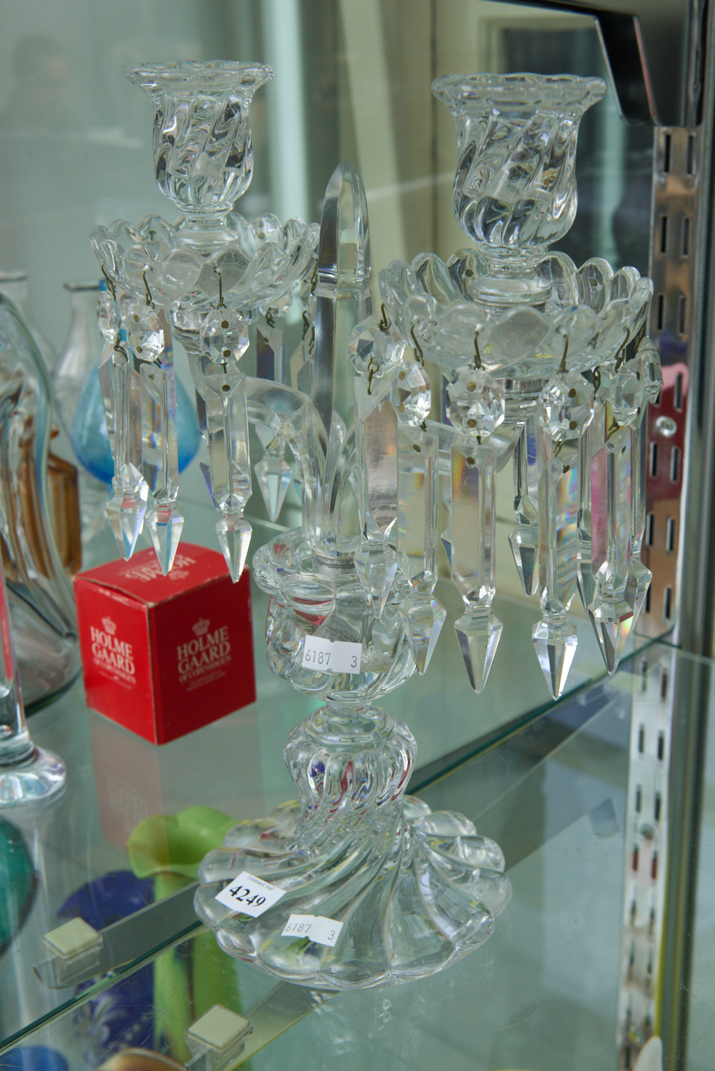 A BACCARAT TWO BRANCH CANDELABRA H.33.5CM, LEONARD JOEL LOCAL DELIVERY SIZE: SMALL