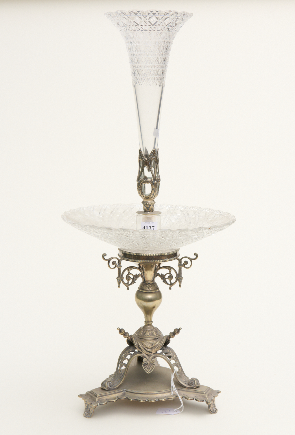 AN EP CENTREPIECE WITH PRESSED GLASS BOWL AND TRUMPET H.58CM, LEONARD JOEL LOCAL DELIVERY SIZE: SMALL
