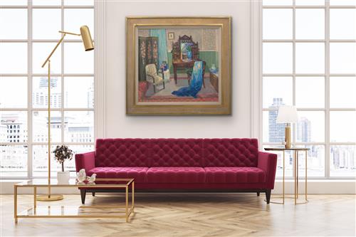The work is in very good condition overall. There are some light scratches to the frame and some water marks lower left on the frame, although these don't appear to have come into contact with the painting. Overall framed size 133.5 x 143.5cm